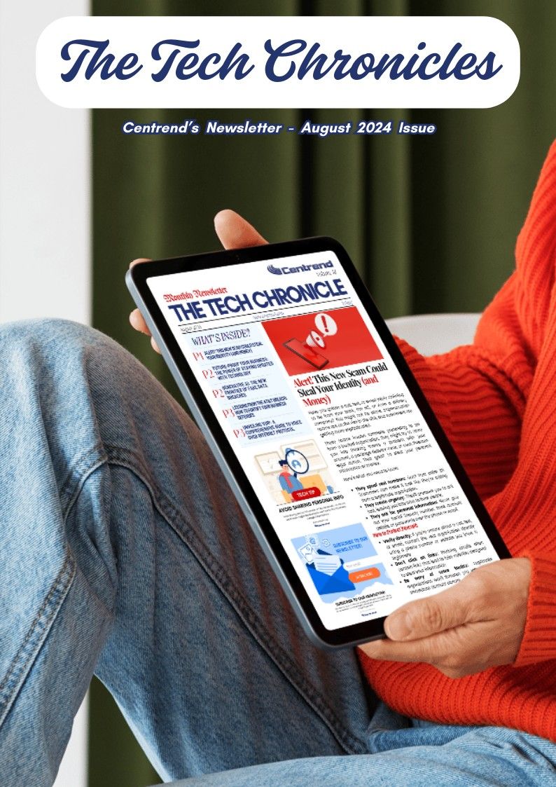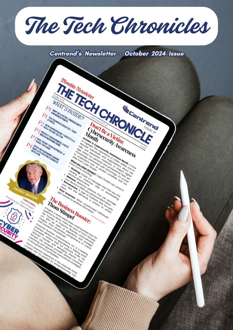 Tablet on a desk displaying Centrend’s Technology Results Newsletter cover for October 2025, Volume 27, featuring Cyber Awareness Month content.
