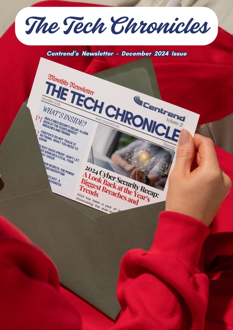 Hand holding a phone in front of a Christmas tree showing Centrend’s Technology Results Newsletter cover for December 2025, Volume 29, focused on CMMC cloud compliance.